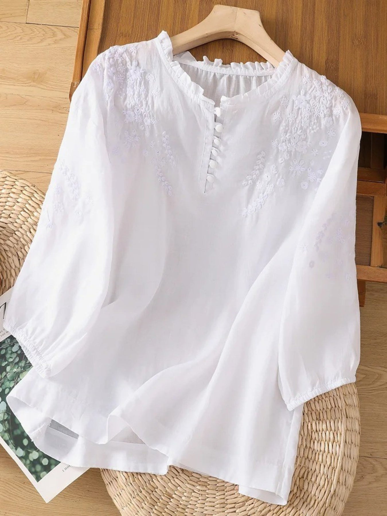 פרטים רקומים עדינים: חולצה זו כוללת רקמה אלגנטית בחזית ובשרוולים, המוסיפה אמנות עדינה לגזרה קלאסית. התפירה העדינה יוצרת דוגמאות בהשראת פרחים המעניקות מראה בעבודת יד. היא מוסיפה מרקם ורכות מבלי להשתלט על המראה הכללי.